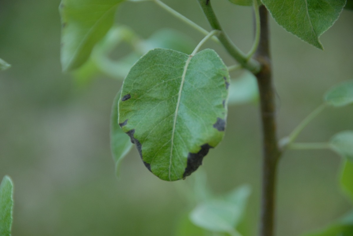 Caption: Pear leaf singed by fireblight