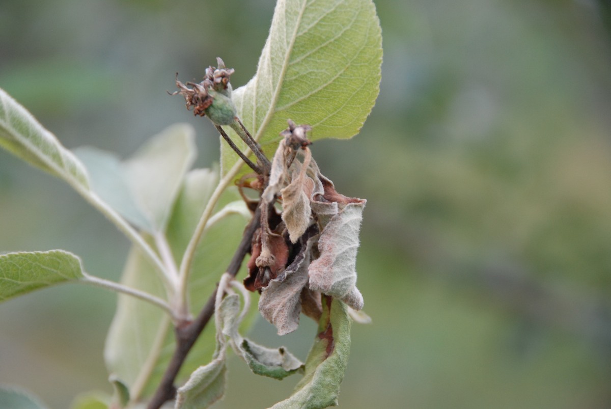 Caption: Fireblight on late blooming cider apple